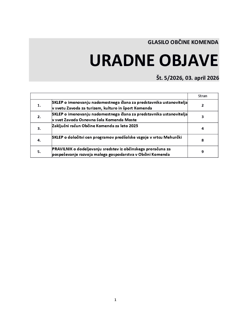 SKLEP o imenovanju nadomestnega člana za predstavnika ustanovitelja v svetu Zavoda za turizem, kulturo in šport Komenda (Uradne objave 05/2026)