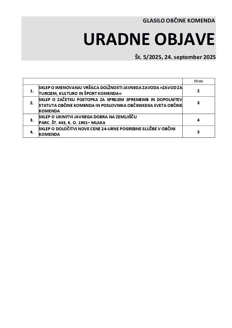Sklep o določitvi nove cene 24-urne pogrebne službe v občini Komenda (Uradne objave 5/2025)