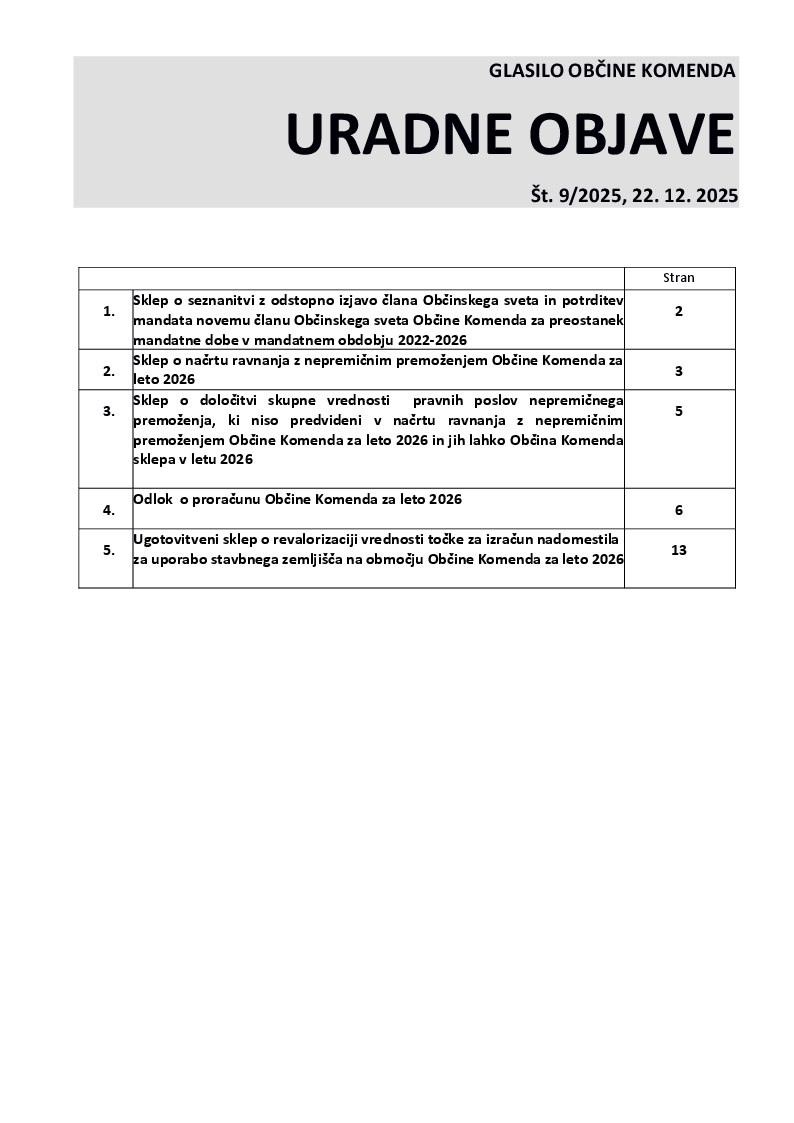 Sklep o določitvi skupne vrednosti pravnih poslov nepremičnega premoženja, ki niso predvideni v načrtu ravnanja z nepremičnim premoženjem Občine Komenda za leto 2026 in jih lahko Občina Komenda sklepa v letu 2026 (Uradne objave 9/2025)