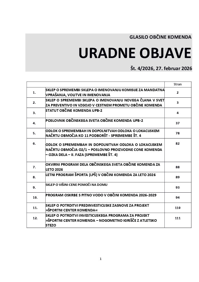 SKLEP O SPREMEMBI SKLEPA O IMENOVANJU NOVEGA ČLANA V SVET ZA PREVENTIVO IN VZGOJO V CESTNEM PROMETU OBČINE KOMENDA (Uradne objave 04/2026)